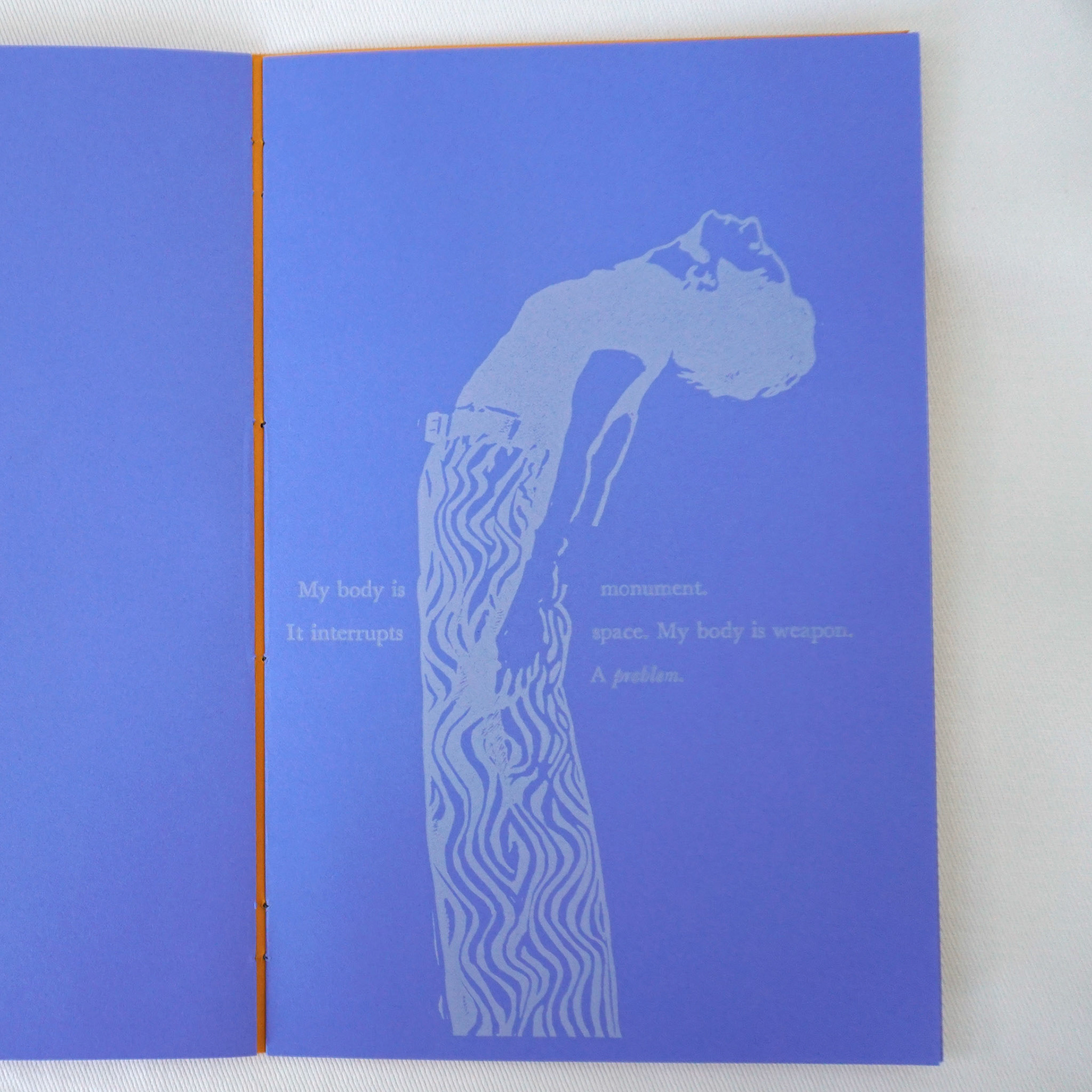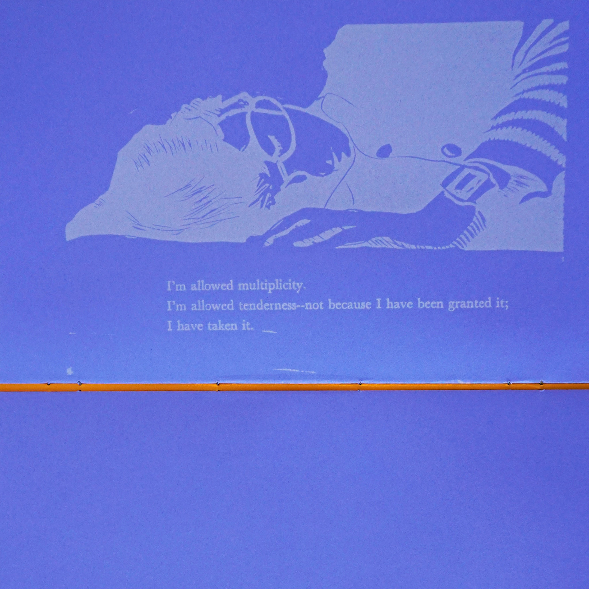 These books were bound in an edition of 31. They were printed in the Walter Feldman Book Arts Studio with five linoleum carvings and six pages of handset Baskerville type. The paper is Neenah Astrobrights.